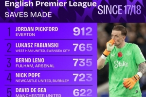 体育资讯11月19日讯 Squawka统计17-18赛季至今英超门将扑救次数,皮克福德912次居首,法比安斯基第二。