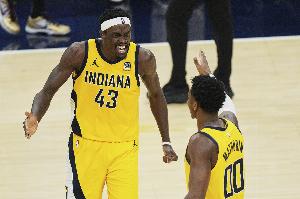 上半场步行者四人得分上双,分别是马瑟林16分5板1助、西亚卡姆11分1板3助、赫夫10分4板4助3帽、内姆哈德10分5助。