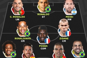 体育资讯11月20日讯 前法国国脚、前皇马前锋、2022年金球先生本泽马,日前评选出自己心目中的足坛历史梦幻11人阵。其中,梅西、C罗、大罗三人领衔锋线,小罗、齐达内、博格巴坐镇中场。