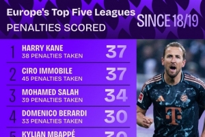 体育资讯11月21日讯 Squawka统计了2018-2019赛季以来球员在五大联赛的点球进球数量,并列出榜单,凯恩、因莫比莱37球居首,萨拉赫34球第三。
