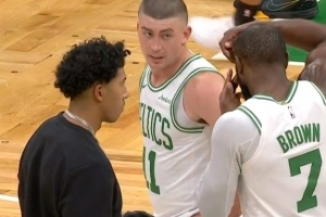 火气十足!斯图尔特和杰伦·布朗卡位互相推搡 双方皆吃T!
