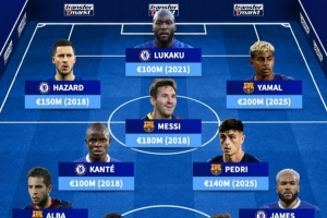 体育资讯11月26日讯 北京时间今晚凌晨4点,欧冠联赛阶段第5轮,切尔西主场迎战巴萨。赛前,德转评出这两支球队历史最贵11人阵容,其中梅西、亚马尔领衔锋线,阿扎尔、卢卡库在列。这套阵容的总身价达12.5亿欧元。