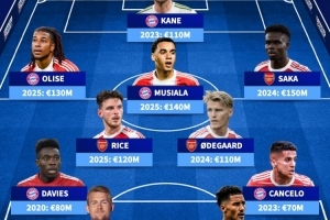 中场/边锋:赖斯(2025年1.2亿欧)、厄德高(2024年1.1亿欧)、奥利塞(2025年1.3亿欧)、穆西亚拉(2025年1.4亿欧)、萨卡(2024年1.5亿欧)