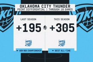 本赛季前18场比赛雷霆总净胜分为+305,为NBA历史最佳;上赛季同期雷霆该数据为+195。