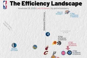 横轴代表进攻效率,越靠右越好,纵轴代表防守效率,越靠上越强。第一象限的球队多为发挥出色的球队,而在第三象限的球队通常为战绩比较糟糕的球队。