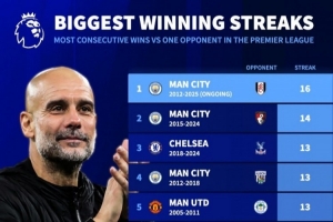 体育资讯12月3日讯 本轮英超焦点战,曼城在客场5-4险胜富勒姆,也延续了面对对手的英超16连胜。《转会市场》统计了英超历史面对同一对手的最长连胜榜,曼城独占7席。