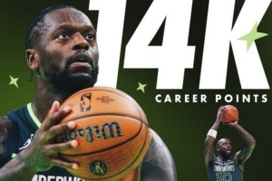 森林狼官方统计,兰德尔生涯总得分突破14000,排在现役第34位。