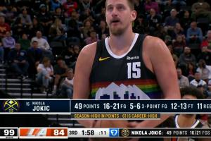 掘金VS快船,三节结束,约基奇52分11篮板6助攻1抢断1盖帽,22投17中,三分6中5,罚球14罚13中!各节得分分布:25+8+19。