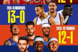 开赛13场后,雷霆以12胜1负的战绩追平了96公牛的同期纪录,在杰伦·威廉姆斯因手腕伤势持续缺阵的情况下,雷霆在13场比赛中净胜对手202分,场均净胜分高达惊人的15.5分。