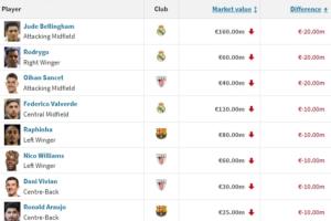 体育资讯12月12日讯 德转更新西甲身价,跌幅排行中,贝林厄姆、罗德里戈和桑塞特下跌2000万欧最多。