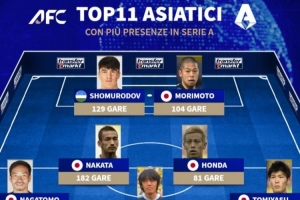 体育资讯12月13日讯 德转列意甲出场最多的亚洲球员11人阵容,中田英寿、长友佑都、奥代罗在列。
