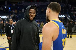 赛后,库里和爱德华兹在场边寒暄。