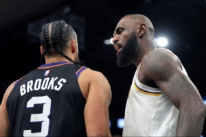 考虑到布鲁克斯上次交手后针对勒布朗和湖人发表的言论,你本该预料到冲突会很早发生。通常情况下勒布朗会无视布鲁克斯,但这个周日非比寻常,冲突在上半场升级,导致勒布朗在对位布鲁克斯时领到了一次进攻犯规。