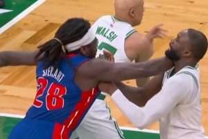 火气十足!斯图尔特和杰伦·布朗卡位互相推搡 双方皆吃T!