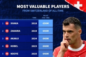 体育资讯11月16日讯 日前,德国转会市场统计了瑞士球员历史最高身价排行,扎卡5000万欧居首。