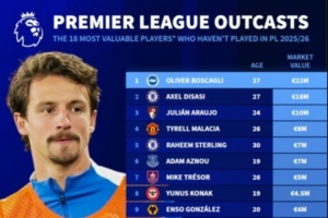 *榜单中一共有18名非门将球员,这些球员没有受到伤病困扰,但至今未在本赛季英超出战过1分钟。