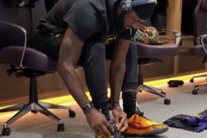 赛前,詹姆斯在更衣室哼着小曲,同时穿上了他最新一代签名鞋“詹23”。这将是詹姆斯首次在正式比赛中穿这双鞋。